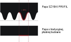 Icopal S.A. przed wprowadzeniem pap SZYBKI PROFIL na rynek przeprowadził badania porównawcze zgrzewania pap z dolną powierzchnią płaską i profilowaną. Z naszych badań, przeprowadzonych wielokrotnie i bardzo wnikliwie wynika, że papy profilowane SZYBKI PROFIL można układać aż o 30% szybciej w stosunku do zwykłych pap płaskich a do ich ułożenia zużywa się 25% mniej gazu.