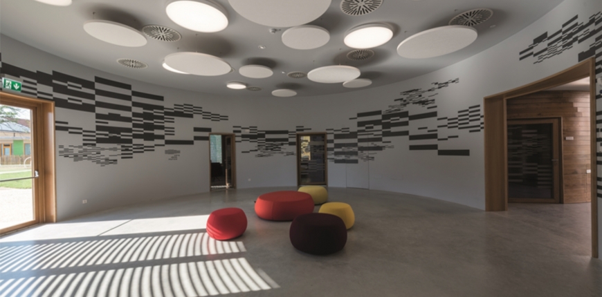 Szczególnie wyrafinowanym rozwiązaniem w ofercie Knauf AMF są absorbery ścienne. Stosuje się je przede wszystkim w salach konferencyjnych, gdzie doskonale sprawdzają się jako elementy łączące w sobie cechy akustyczne i architektoniczne. Absorbują szum akustyczny oraz eliminują tak zwane płaskie echo (Flattenecho) pomiędzy ścianami. W ten sposób w znaczącym stopniu spada zanieczyszczenie akustyczne pomieszczenia i rozmówcy mogą porozumiewać się między sobą dużo swobodniej, nie forsując gardeł. Specjalna warstwa wykończeniowa umożliwia nadruk na nich dowolnych elementów graficznych. Ich montaż jest równie prosty, jak zawieszenie obrazu.