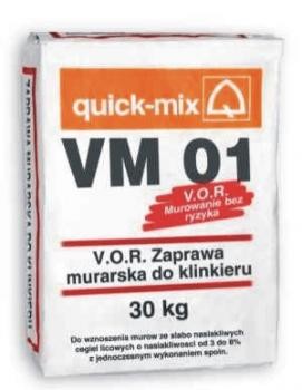 - a więc przyczepność i szczelność - w znacznym stopniu zależą od tego jak dalece uda się dostosować i dobrać odpowiednią zaprawę murarską V.O.R. do charakterystyki absorpcyjnej cegły. Dla każdego rodzaju zaprawy dozowane są celowo środki, które zatrzymują wodę, gdy zaprawa jest jeszcze świeża zapobiegając w ten sposób twardnieniu zaprawy na powierzchni styku z cegłą. W przypadku cegieł o dużej nasiąkliwości nie jest więc konieczne wstępne zwilżanie cegieł przy zastosowaniu zaprawy VKplus lub VK01. W przypadku cegieł o bardzo słabej nasiąkliwości woda pracuje w opóźnionym trybie, przez co woda deszczowa ma ułatwiony dostęp do wnętrza zaprawy wypłukując w ten sposób spoiwo. Zaprawy VM01 i VZ01 zapobiegają temu zjawisku posiadając specyficzną zdolność zatrzymywania cząsteczek wody oraz odpowiedni skład granulometryczny przez co zapobiega się efektowi ślizgania się cegieł (lub utraty przyczepności cegieł) zapewniający odpowiednią porowatość i optymalną stateczność muru. Zaprawy charakteryzują się przy tym również dużą plastycznością i łatwością obróbki. Oznacza to, że stosowana na budowie zaprawa jest zawsze dostosowana do odpowiedniego typu cegły. Zaprawy V.O.R. mają aprobatę techniczną ITB : AT-15-4021/99. Przy stosowaniu zapraw murarskich quick-mix oprócz niewątpliwych zalet technicznych samego produktu, znaczącą i decydującą zaletą jest duże bezpieczeństwo. Przy zastosowaniu techniki: